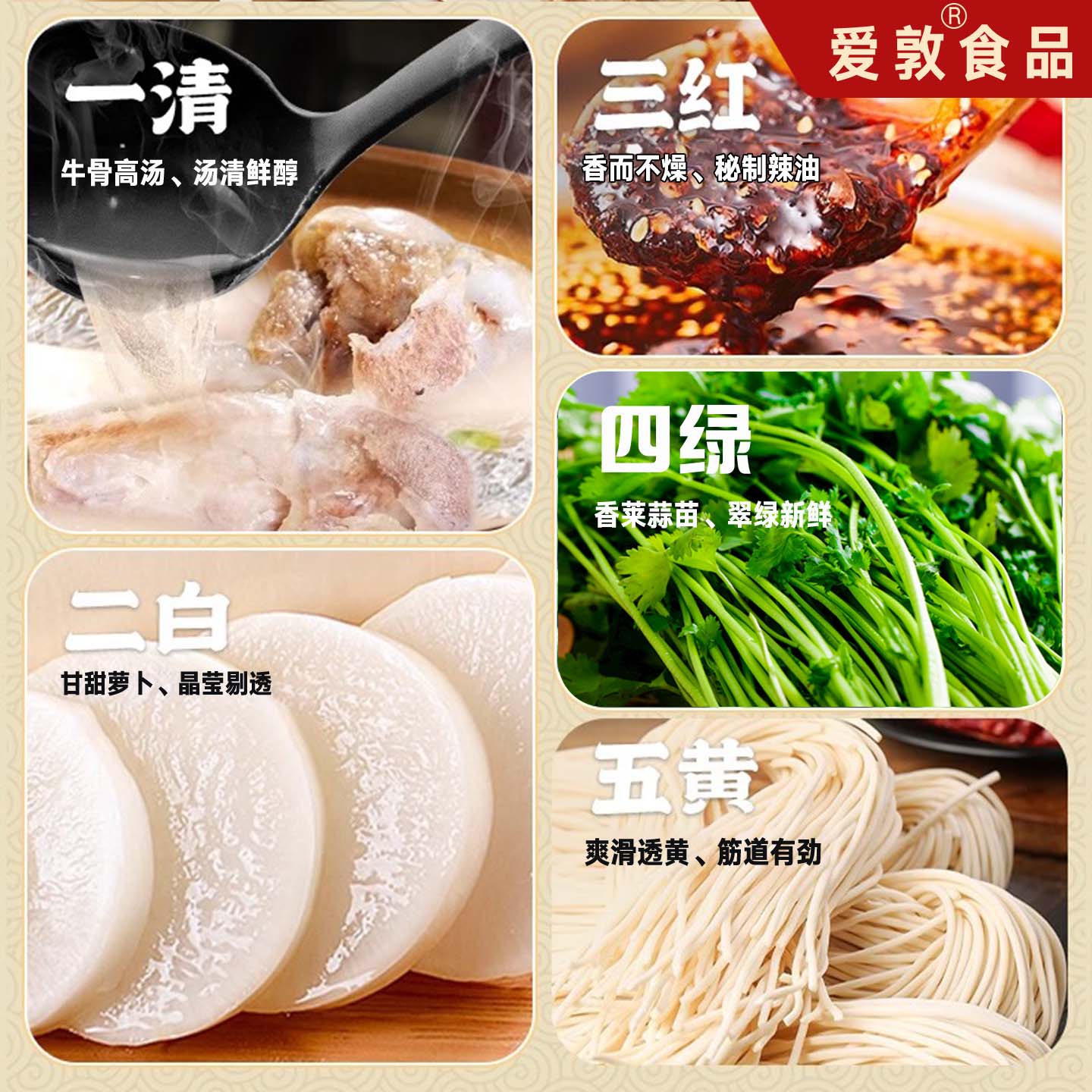 牛肉汤, 选用优质牛棒骨,配二十几种天然香料精熬6小时 筹就一碗兰州牛肉面; 面条, 选用优质小麦粉,面条筋道爽滑;油辣椒,选材考究,香而不辣,老少皆宜